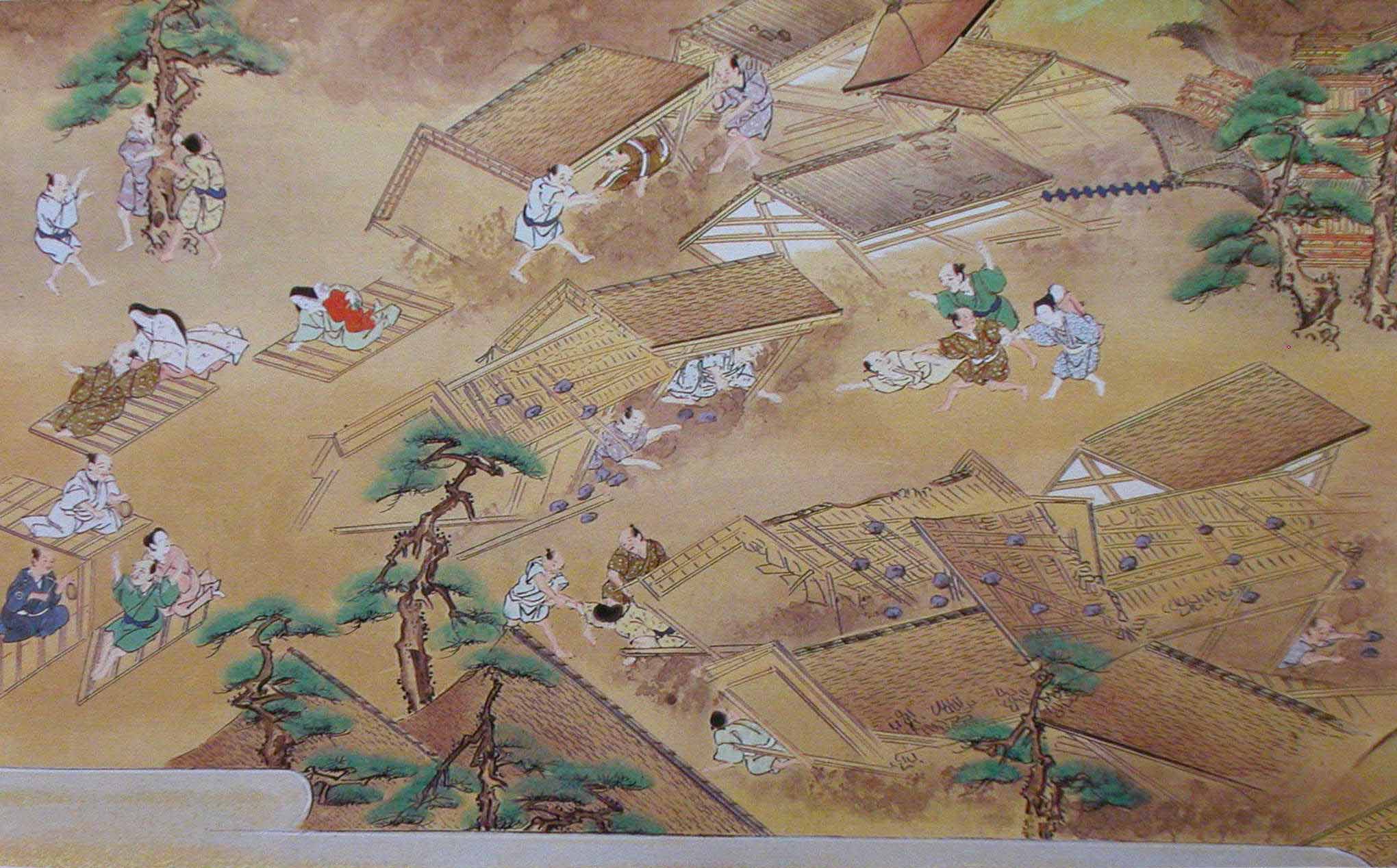1177(安元3)年4月28日、強風が吹き荒れた不穏な夜のことである。戌の時剋(午後8時前後)、都の東南から出火。火は西南に移り、遂には大内裏に至って、朱雀、大極殿、大学寮、民部省などは一夜のうちに消失した。